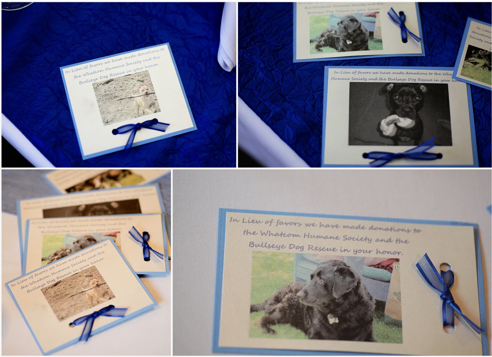 Any "do it yourself" ideas or creations? "In leiu of favors we donated money to the whatcom humane society and the bullseye rescue in seattle. we made cute cards to put on each table with pictures of all of our families different dogs and of course our own."